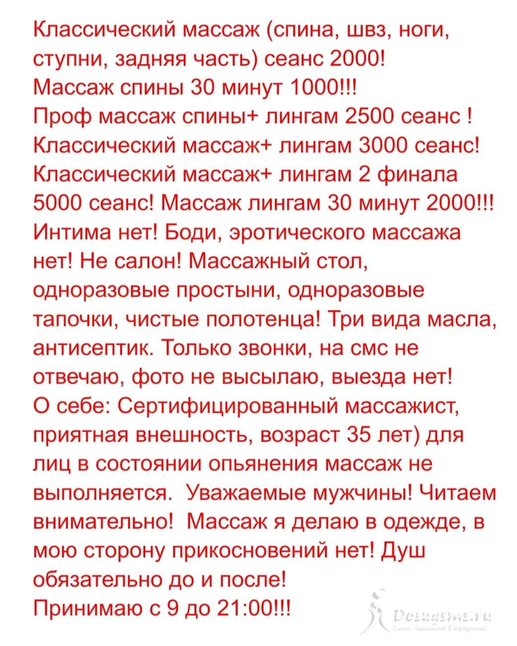 Профессиональная массажистка 55 лет предлагаю услуги расслабляющего релакс массажа с элементами боди и тайского массажа,телом по телу,в конце окончание массаж лингама 2500 час днем,вечер с 18:00-21:00 3000 час с 21:00-24:00 3500 час Мужская интим депиляции,мужской педикюр 2500 днем вечером 3000 Интим услуг нет 89948385870